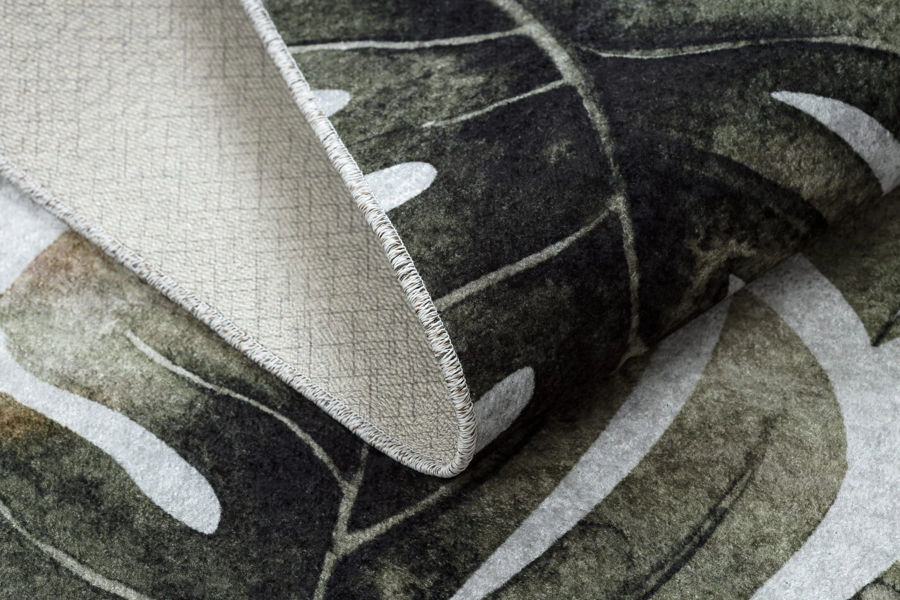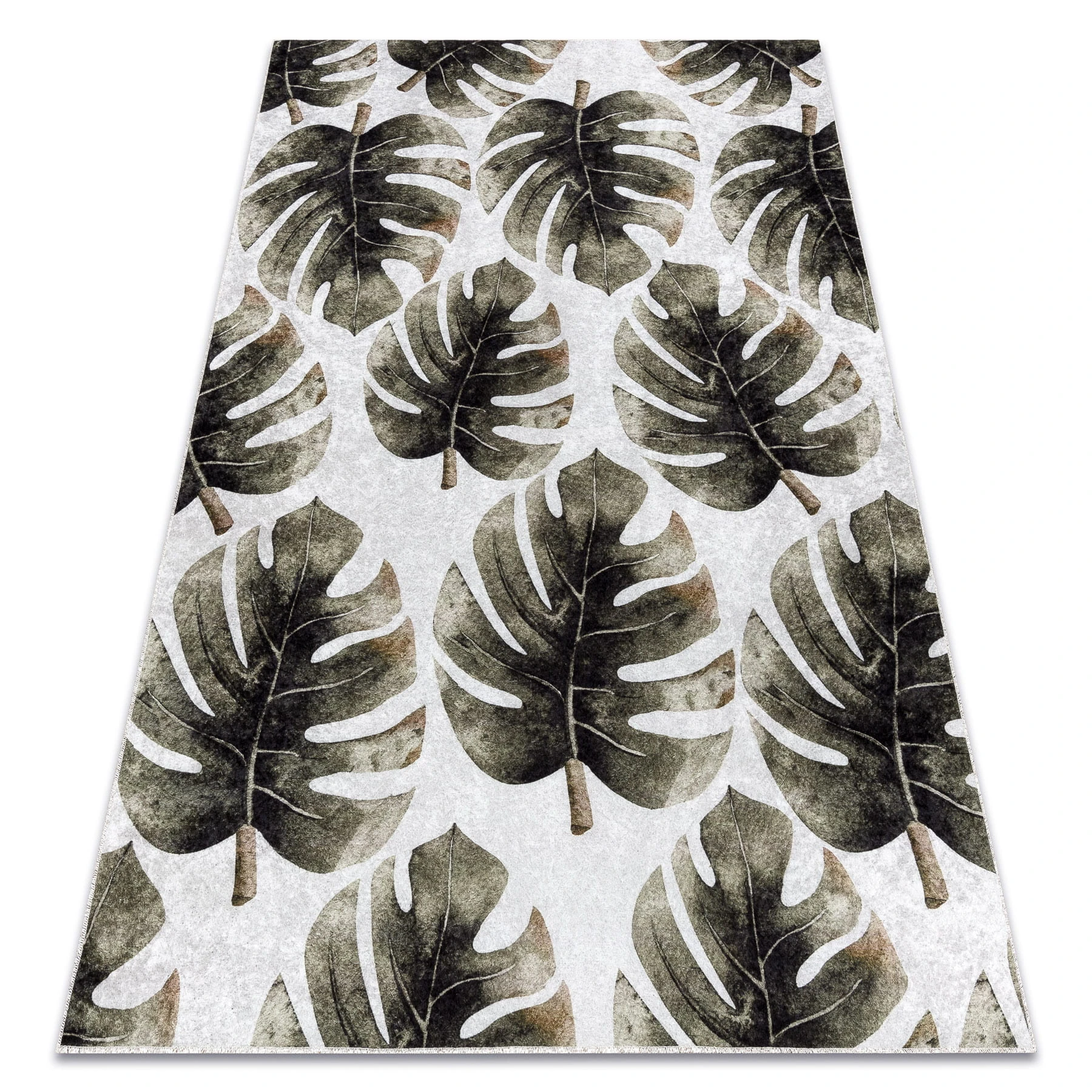 Zielony dywan z wzorem liści monstery, który wprowadzi do wnętrza świeży, botaniczny charakter.
