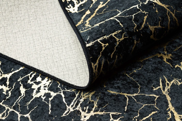 Czarno-złoty dywan z abstrakcyjnym wzorem marmurkowym, który doda salonowi elegancki, nowoczesny charakter.
