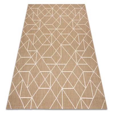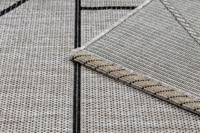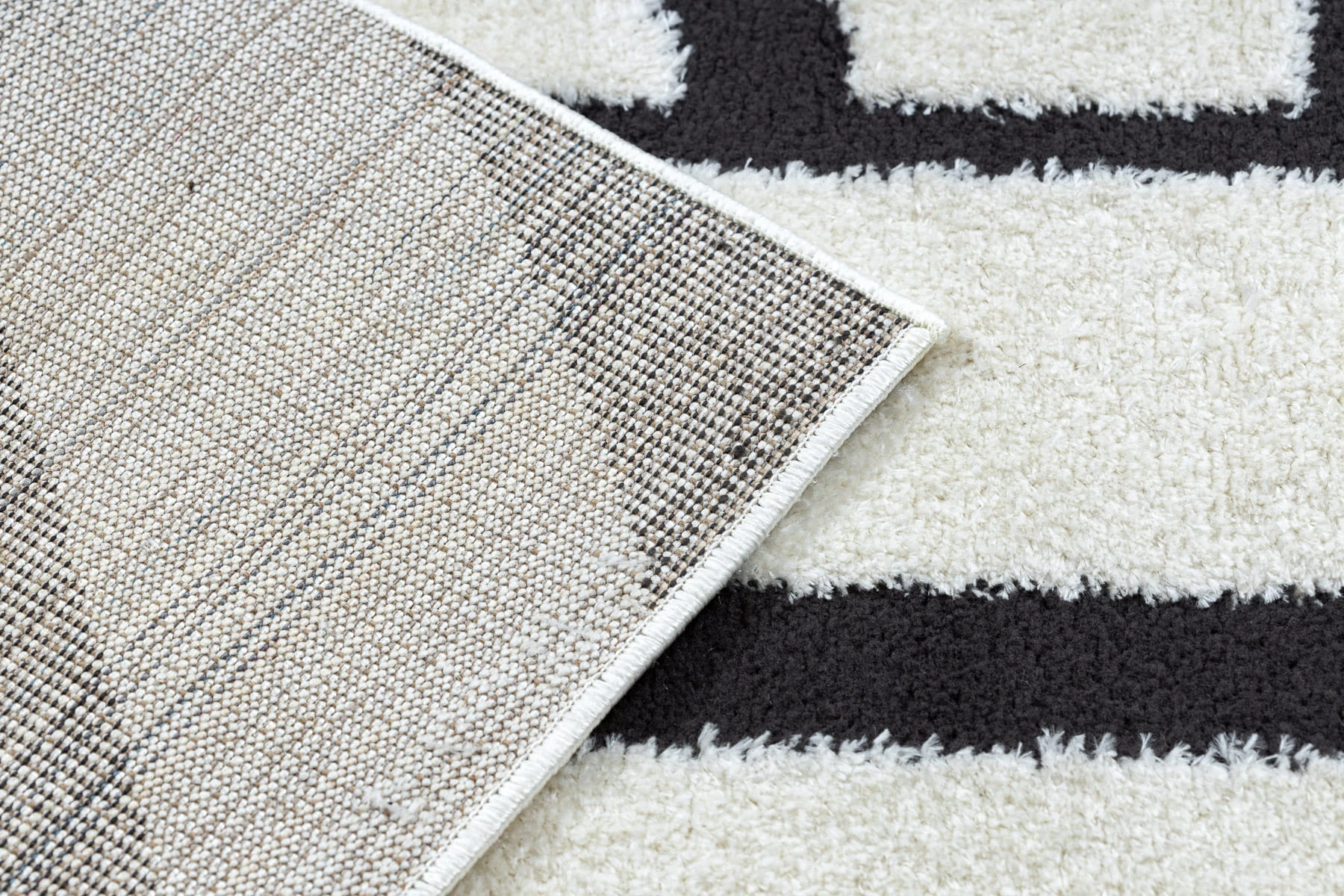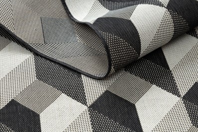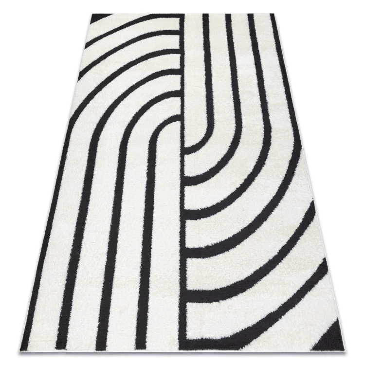 Kremowo-czarny dywan z geometrycznym wzorem, który doskonale sprawdzi się w salonie, nadając mu nowoczesny charakter.