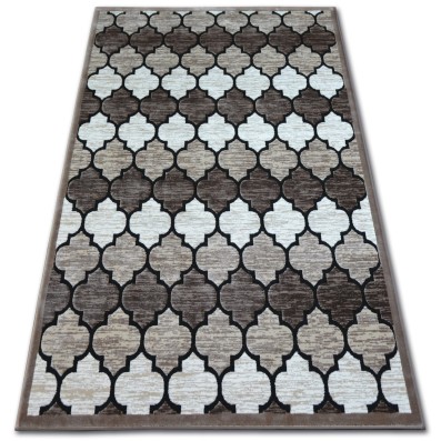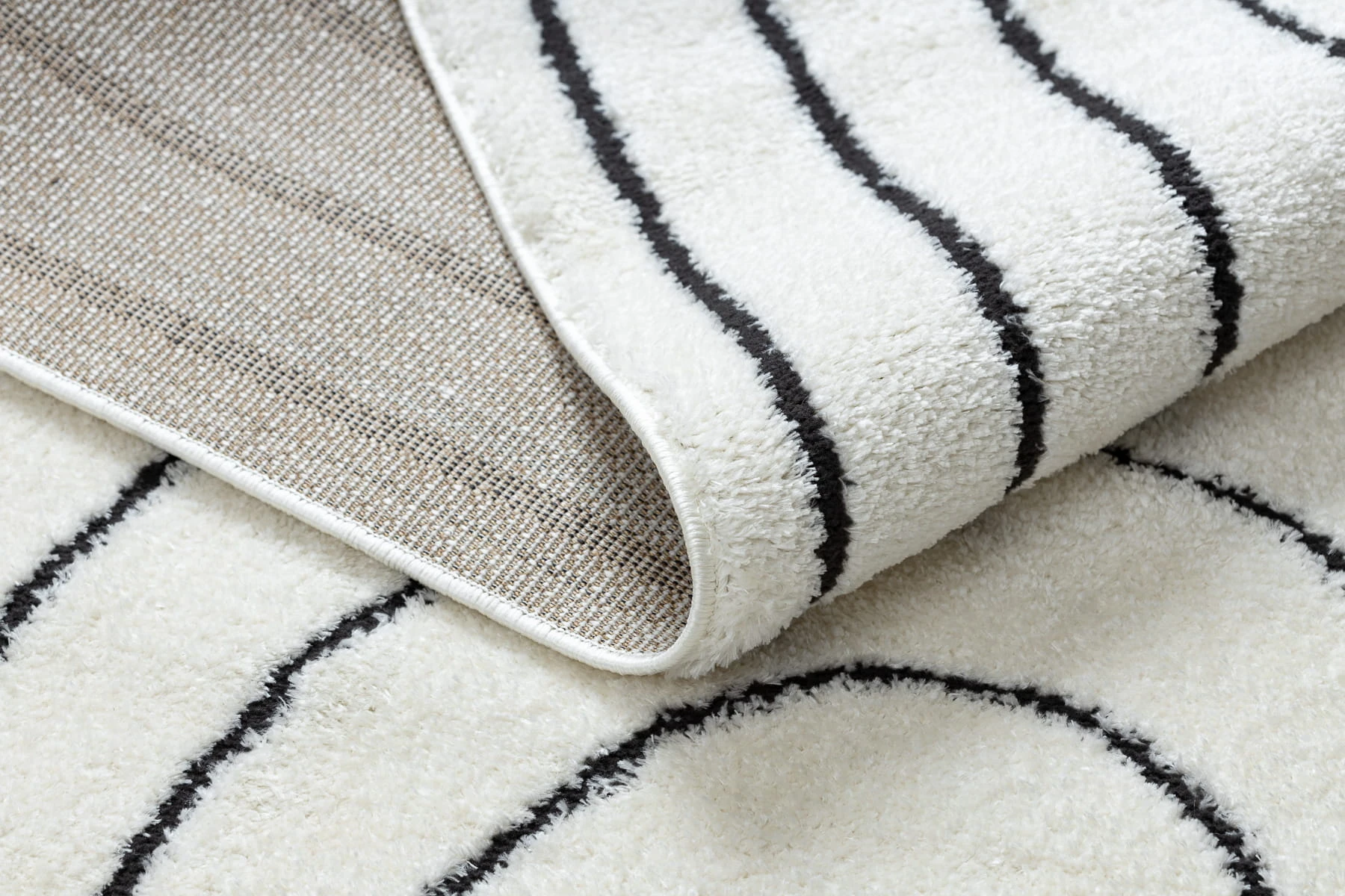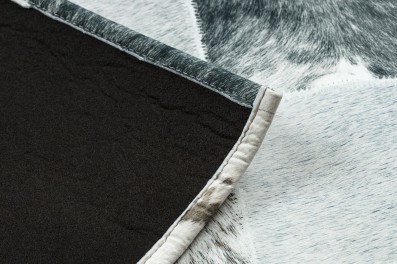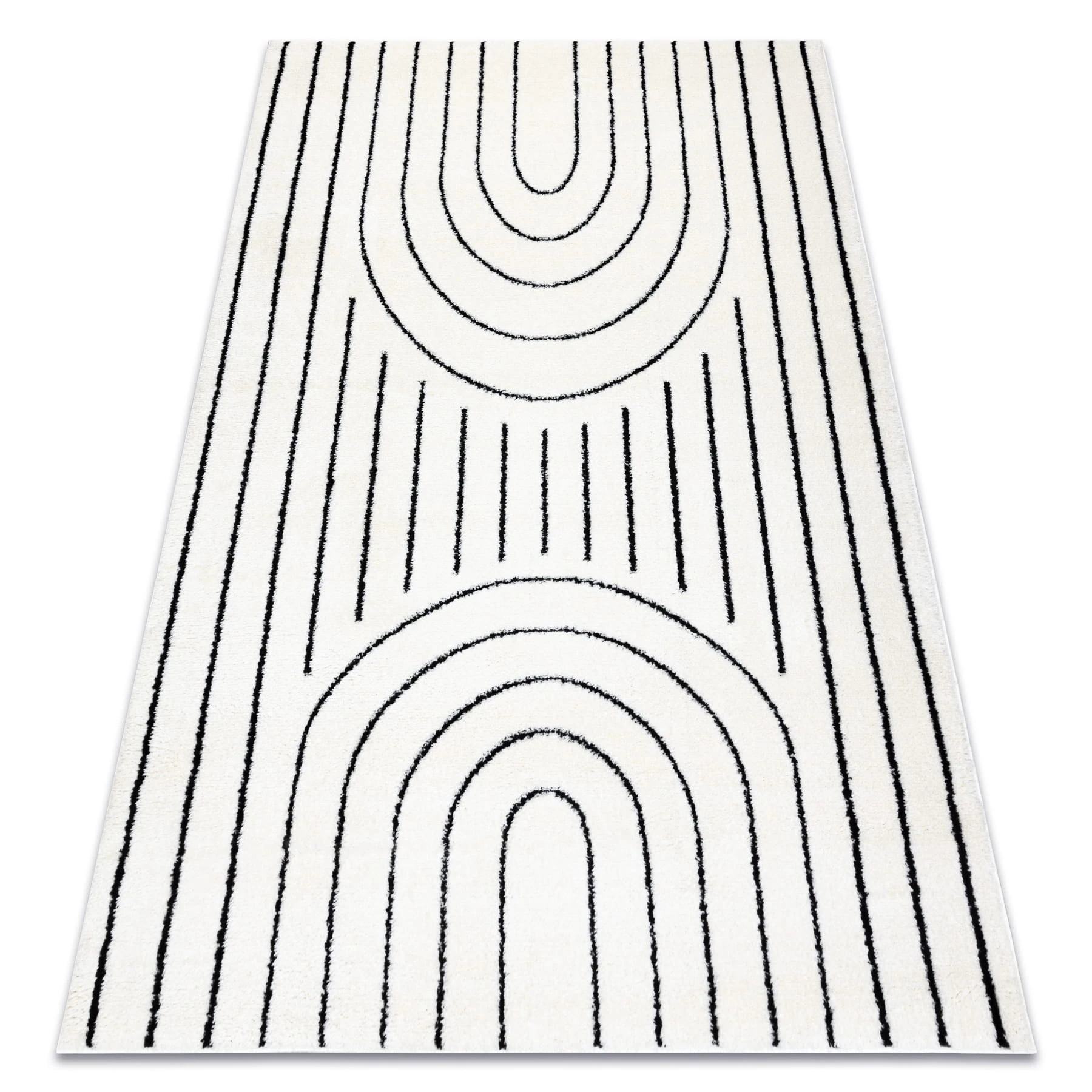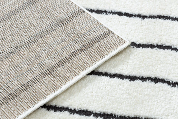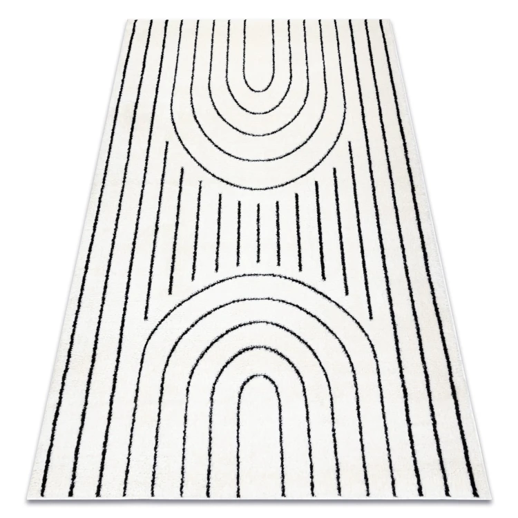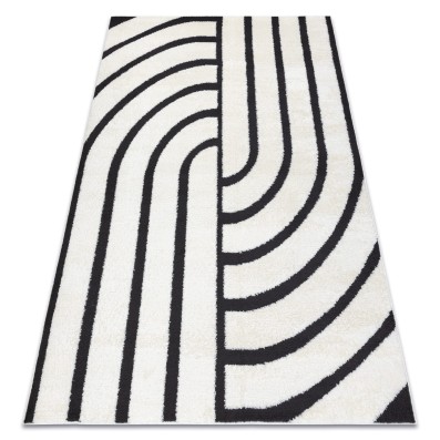 Kremowo-czarny dywan z geometrycznym wzorem, który doskonale wpisze się w nowoczesny salon lub pokój.