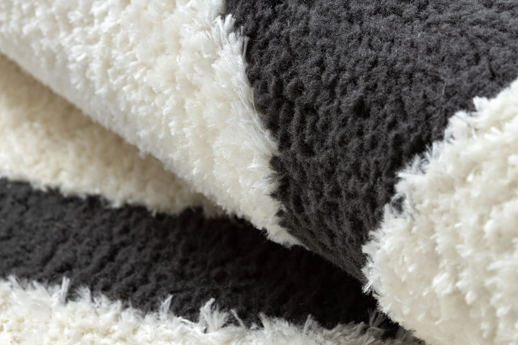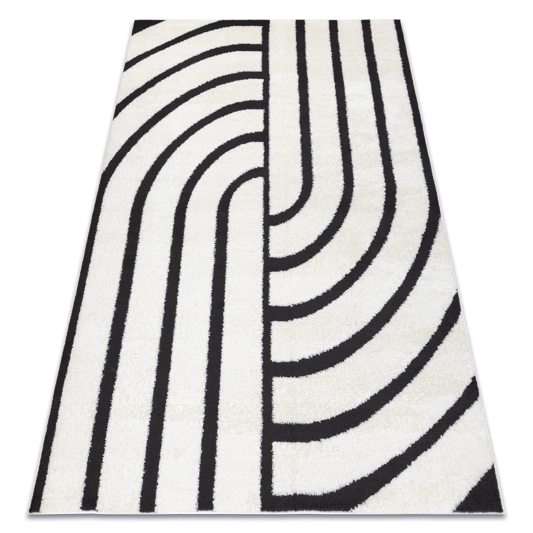 Kremowo-czarny dywan z geometrycznym wzorem, który doskonale sprawdzi się w salonie, nadając mu nowoczesny charakter.