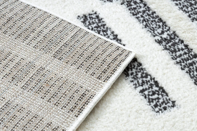 Kremowo-czarny dywan z abstrakcyjnym wzorem, który doskonale wpisze się w nowoczesny salon lub pokój.