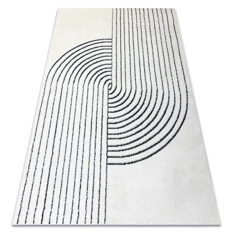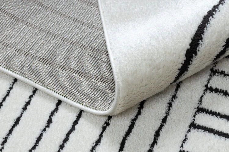 Kremowy dywan z czarnym geometrycznym wzorem, który doskonale sprawdzi się w korytarzu, nadając mu nowoczesny charakter.