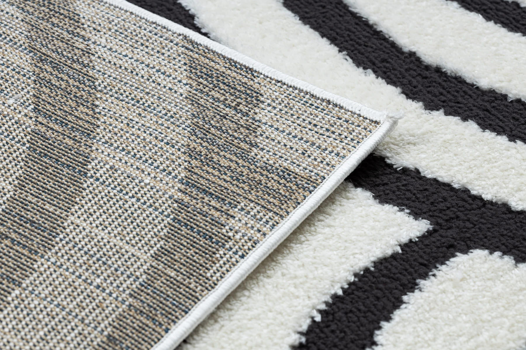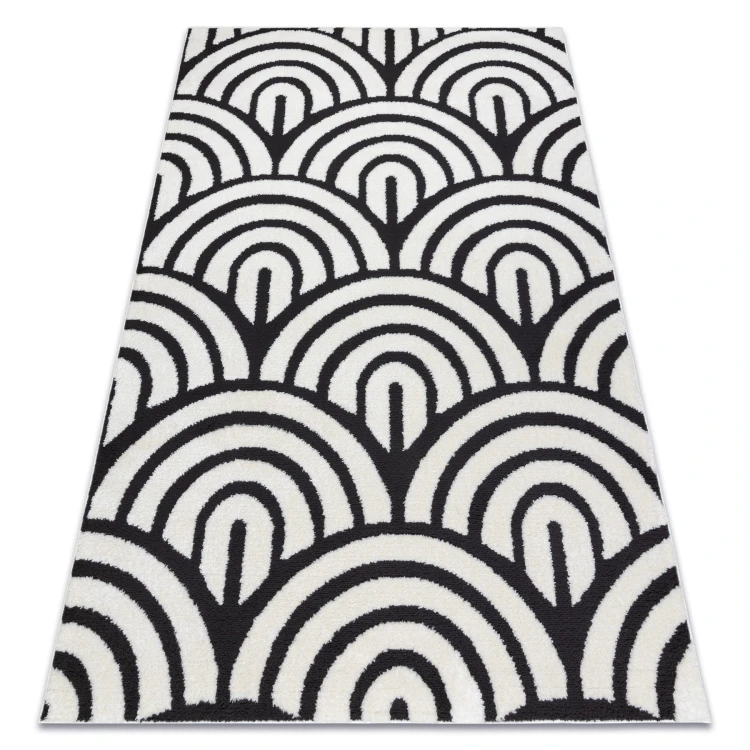 Kremowy dywan z geometrycznym wzorem muszli, który wprowadzi do salonu lub pokoju elegancki akcent w morskim stylu.