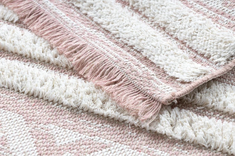 Różowo-kremowy dywan z geometrycznym wzorem rombów, który wniesie do salonu lub pokoju ciepły, kobiecy charakter.