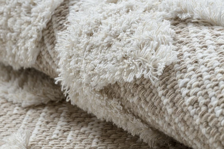 Beżowy dywan z geometrycznym wzorem rombów, który wprowadzi do salonu ciepły, naturalny akcent w klasycznym stylu.