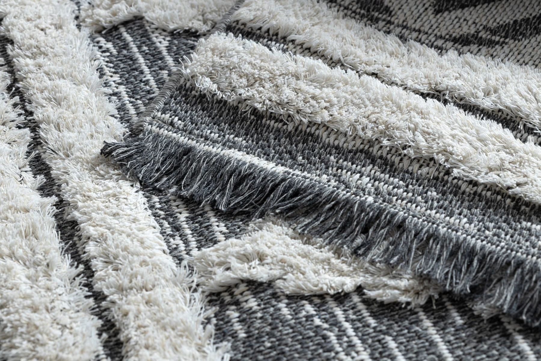 Szaro-kremowy dywan z geometrycznym wzorem rombów, który wprowadzi nowoczesny akcent do salonu lub pokoju.