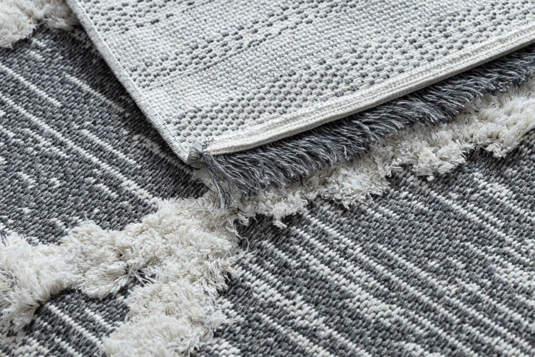 Szaro-kremowy dywan z geometrycznym wzorem rombów, który wprowadzi nowoczesny akcent do salonu lub pokoju.