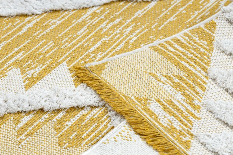 Żółto-kremowy dywan z geometrycznym wzorem rombów, który doda salonowi energetyczny akcent i ciepły charakter.