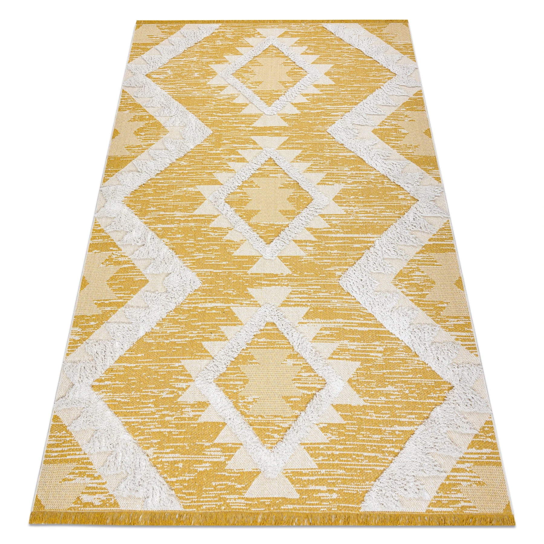 Żółto-kremowy dywan z geometrycznym wzorem rombów, który doda salonowi energetyczny akcent i ciepły charakter.