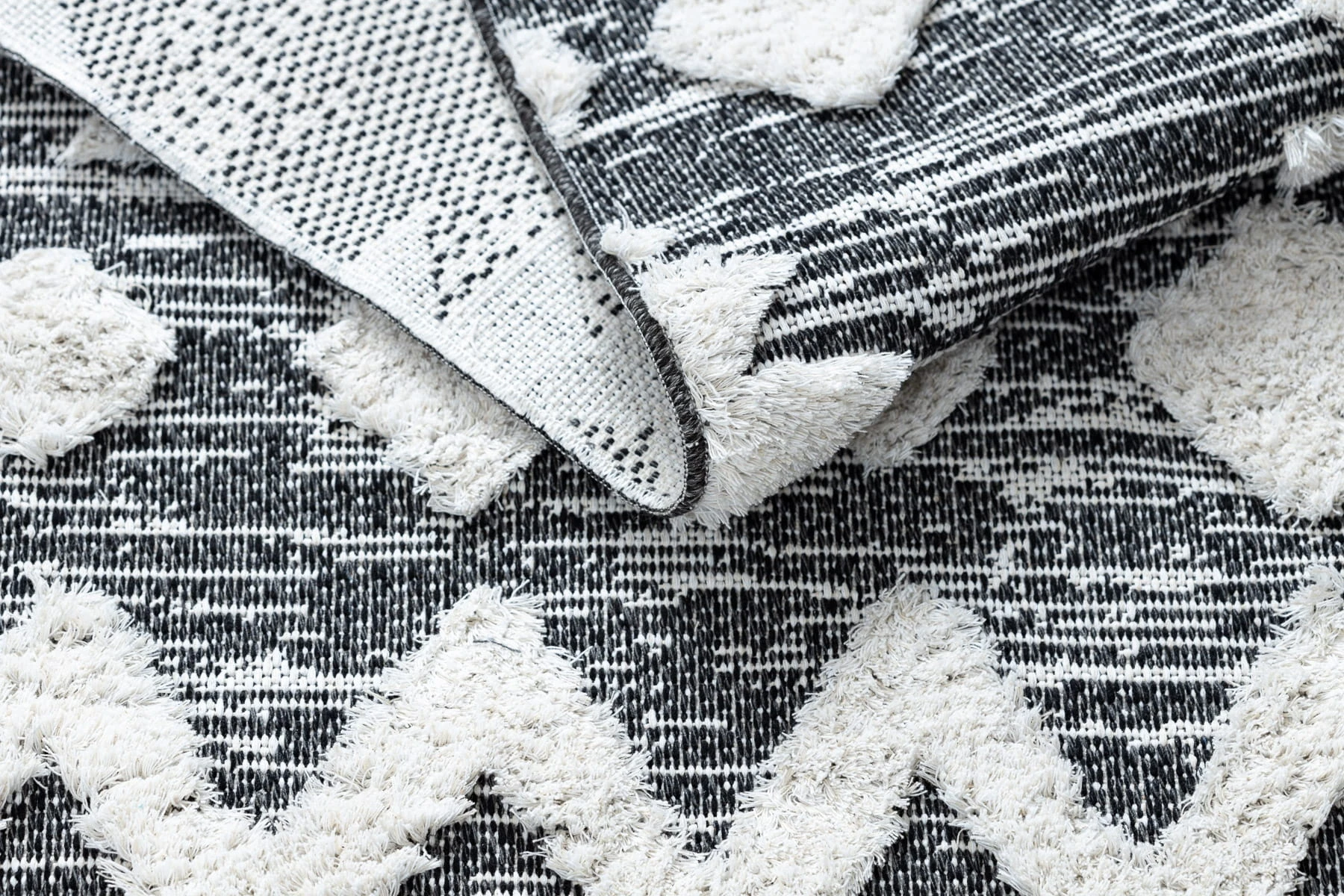 Dywan w odcieniach szarości i kremu, odporny na warunki atmosferyczne, idealny na taras i balkon.