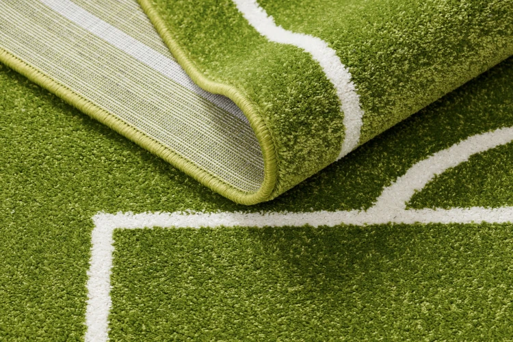Zielony dywan z motywem boiska piłkarskiego, który zamieni pokój dziecka w miejsce pełne sportowych przygód i zabawy.
