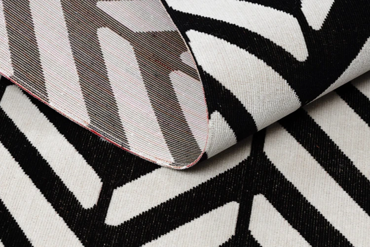 Dywan w odcieniu kremowego z akcentami czerni, odporny na warunki atmosferyczne, idealny na taras i balkon.