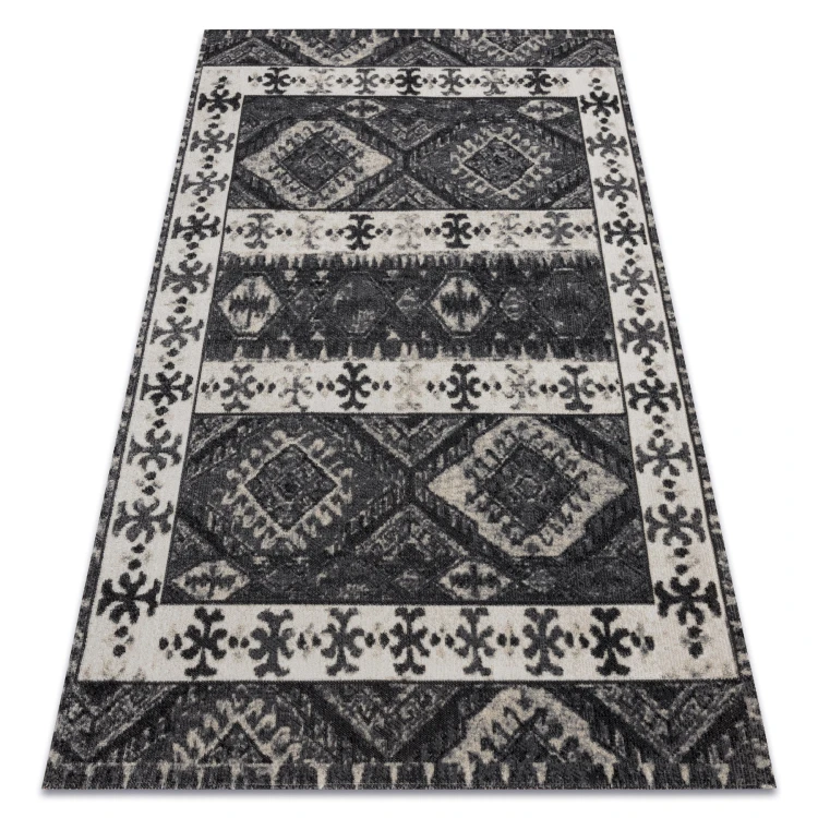 Beżowo-czarny dywan z abstrakcyjnym wzorem, który idealnie wypełni korytarz, nadając mu nowoczesny charakter.