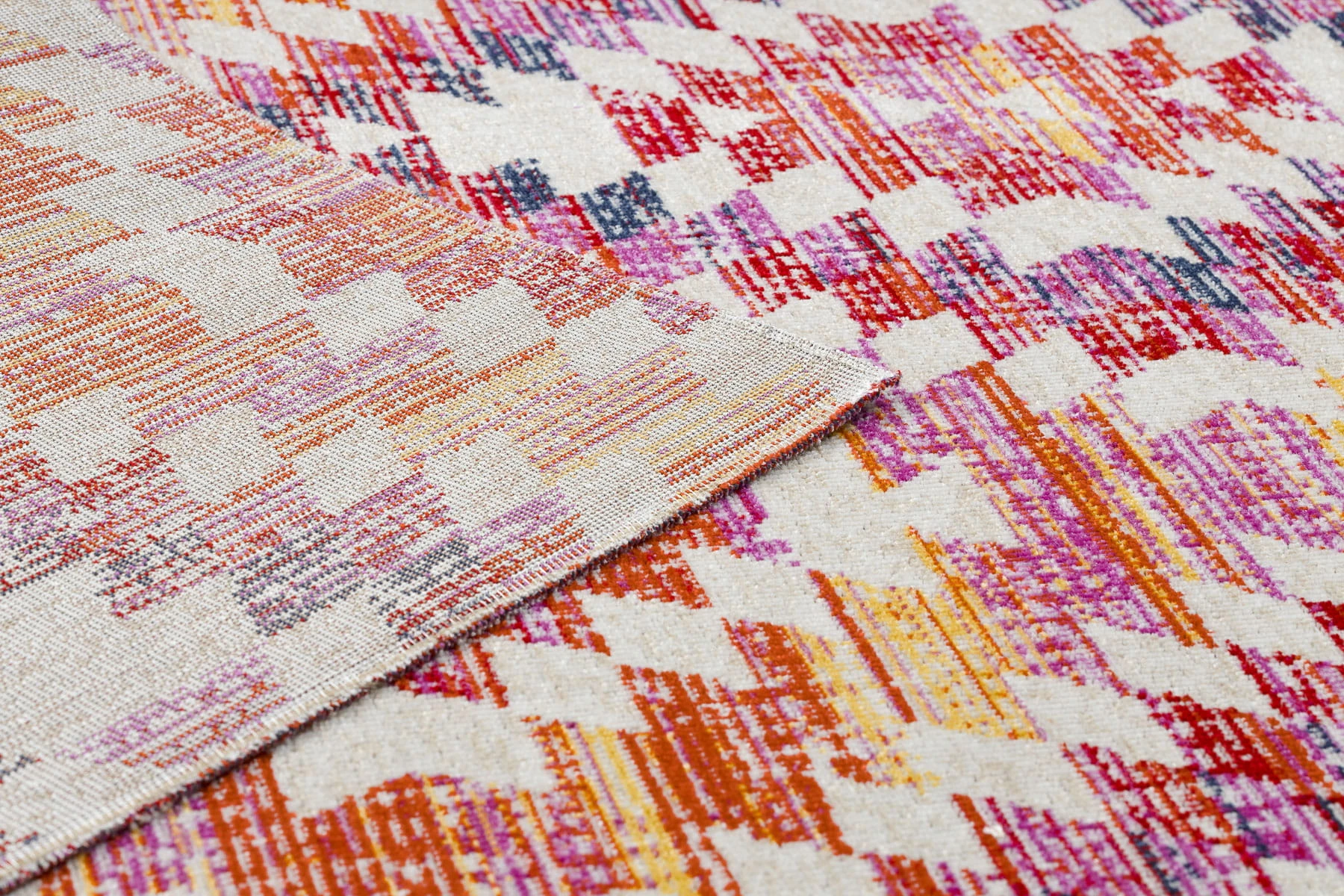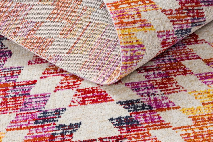 Dywan w odcieniach różu i beżu, odporny na warunki atmosferyczne, idealny na taras i balkon.