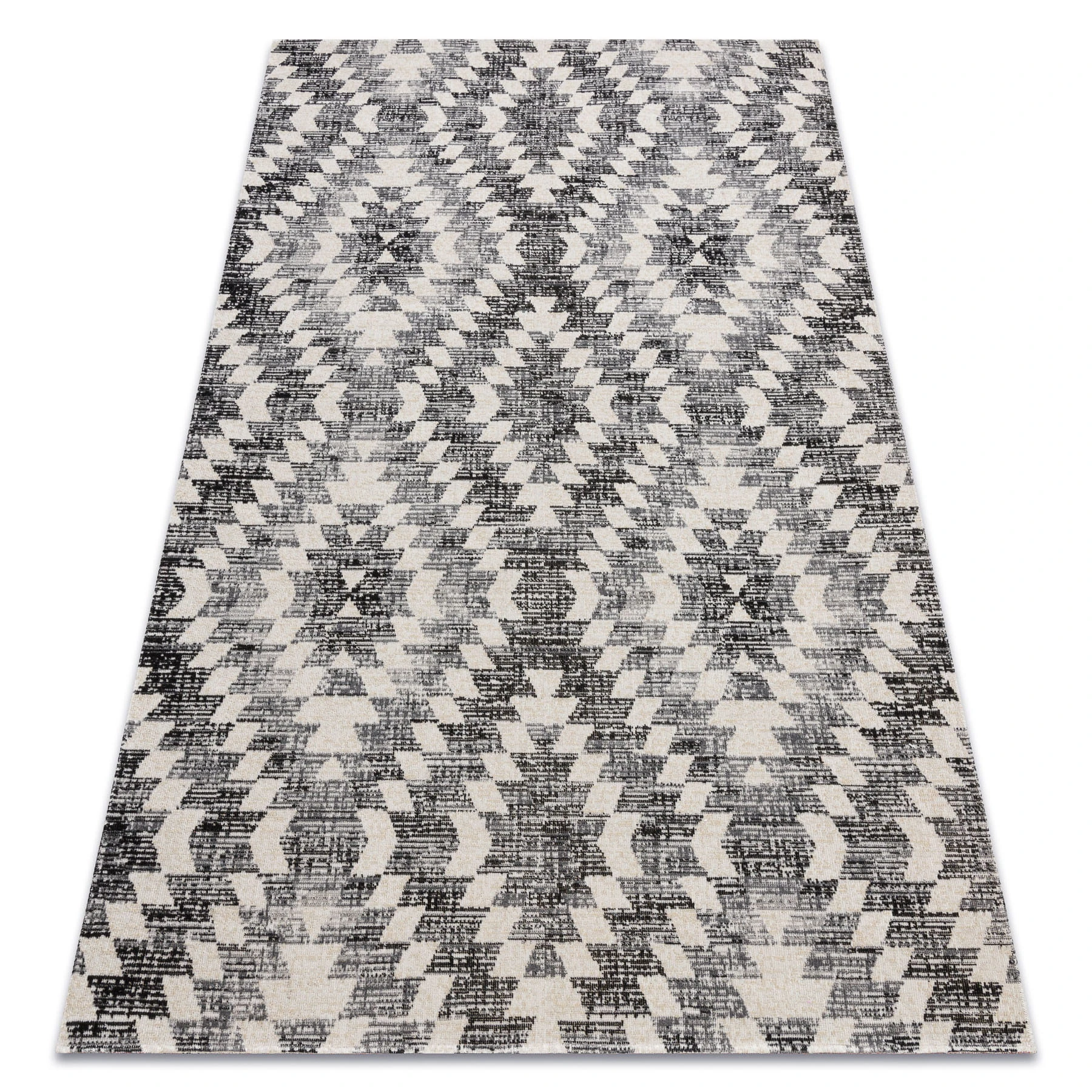 Szaro-beżowy dywan z abstrakcyjnym wzorem rombów 3D, który doda wnętrzu nowoczesny charakter i głębię.
