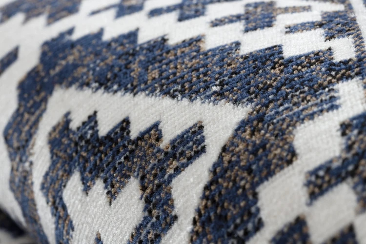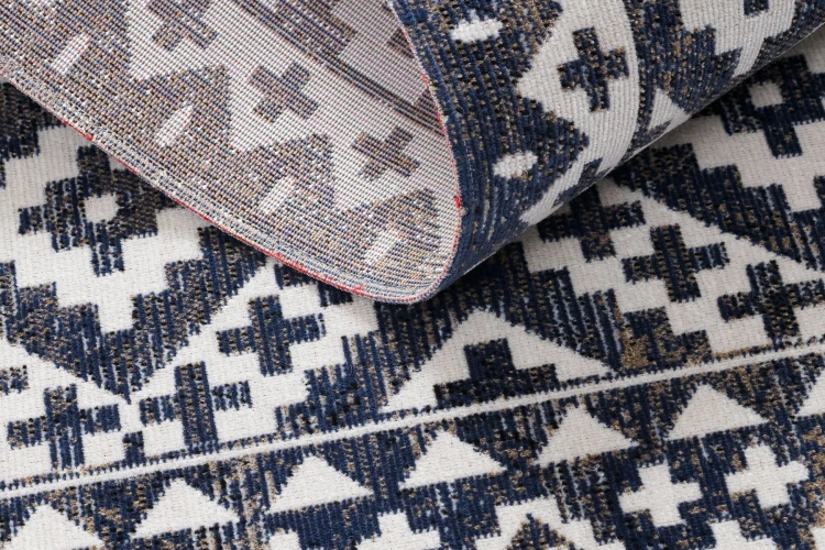 Niebieski dywan z geometrycznym wzorem, który doskonale sprawdzi się w korytarzu, nadając mu nowoczesny charakter.