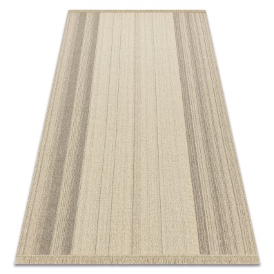Beżowy dywan z wełny z abstrakcyjnym wzorem geometrycznym, który nadaje salonowi elegancki i nowoczesny charakter.