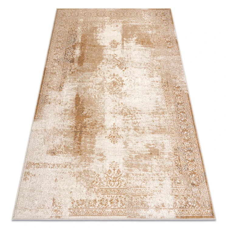 Beżowy dywan z abstrakcyjnym wzorem i elegancką ramką, który doskonale sprawdzi się w salonie, dodając wnętrzu ciepły, stonowany charakter.