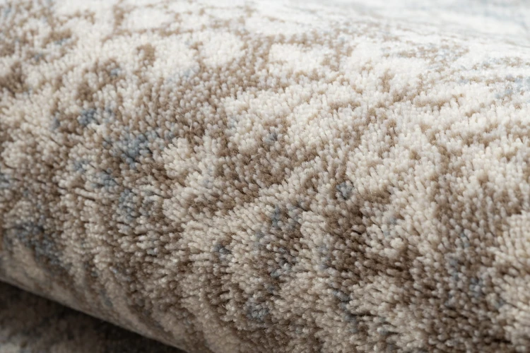 Beżowy dywan z abstrakcyjnym ornamentem, który wprowadzi do salonu lub pokoju ciepłą, stonowaną elegancję.