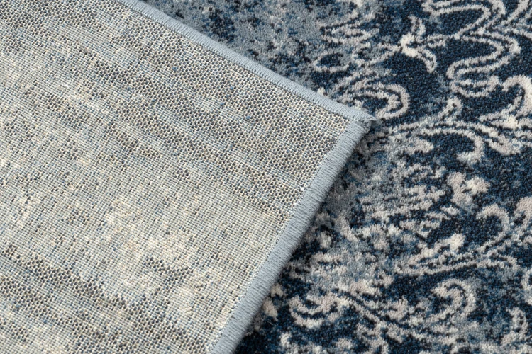 Granatowy dywan z abstrakcyjnym wzorem, który nadaje korytarzowi elegancki i nowoczesny charakter.