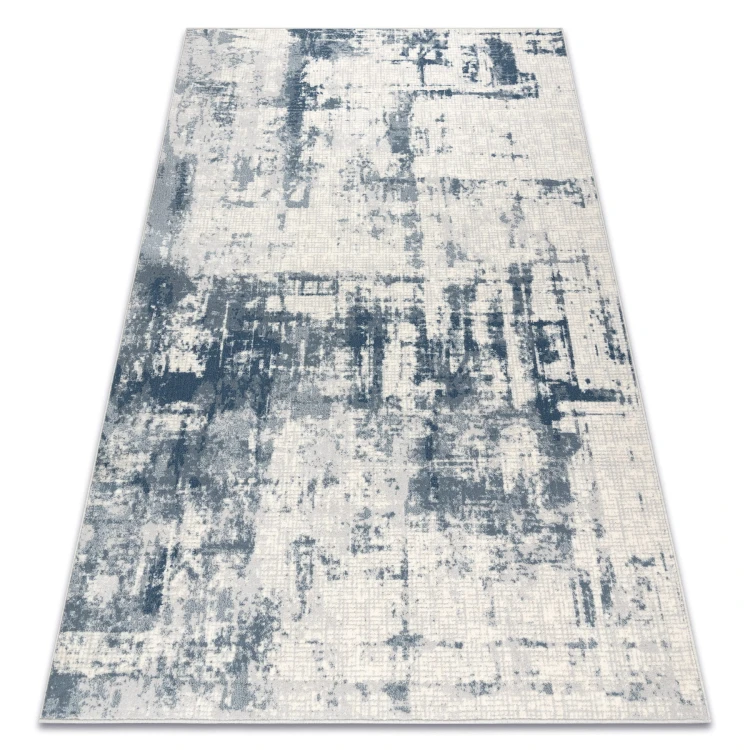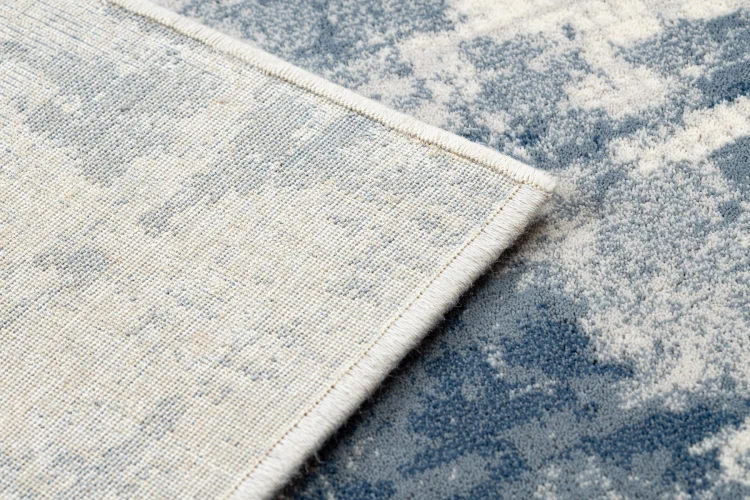 Niebieski dywan z wełny z abstrakcyjnym wzorem, który doda korytarzowi elegancki charakter i wprowadzi spokojną atmosferę.