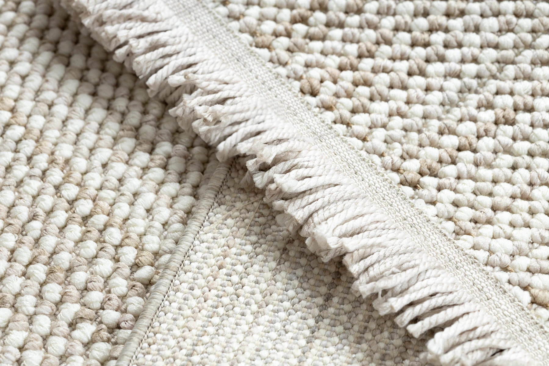 Beżowo-biały dywan z abstrakcyjnym wzorem, który doskonale wpisze się w salon lub pokój, tworząc subtelną, harmonijną atmosferę.