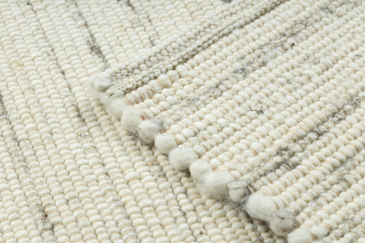 Beżowo-biały dywan wełniany w paski, który wprowadzi do salonu ciepły, naturalny charakter i ponadczasową elegancję.
