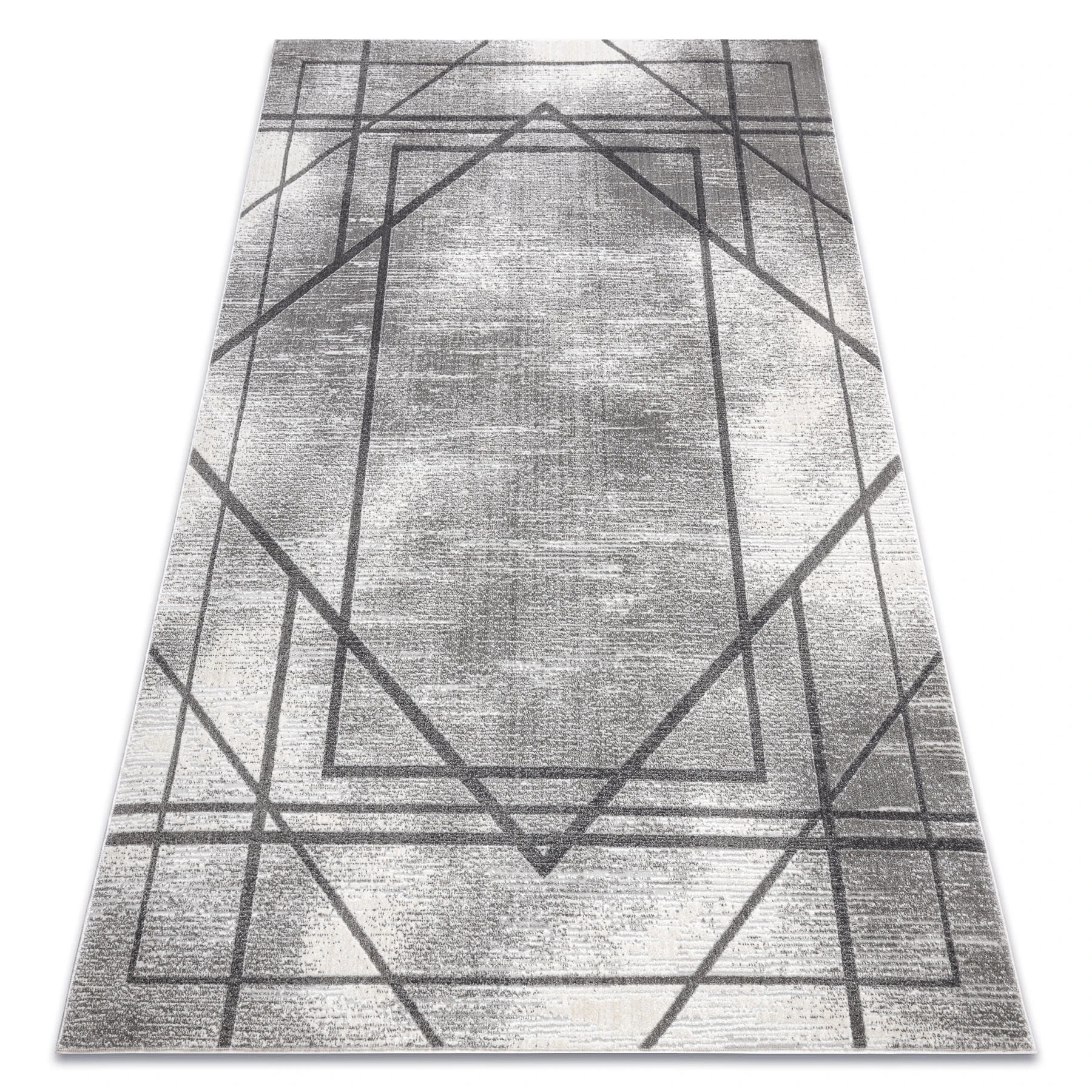 Szary dywan z abstrakcyjnym wzorem, który doskonale wpisze się w nowoczesne wnętrze salonu lub pokoju.