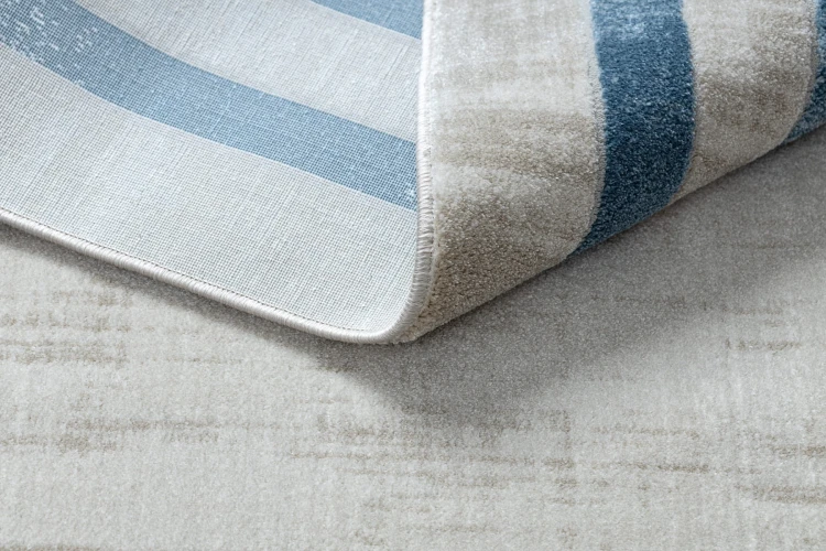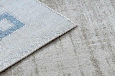 Kremowy dywan z niebieskim wzorem ramki, który doskonale sprawdzi się w salonie, dodając mu klasycznego charakteru.