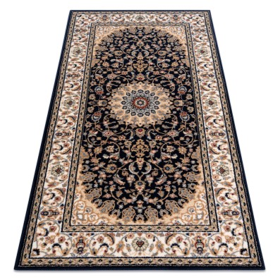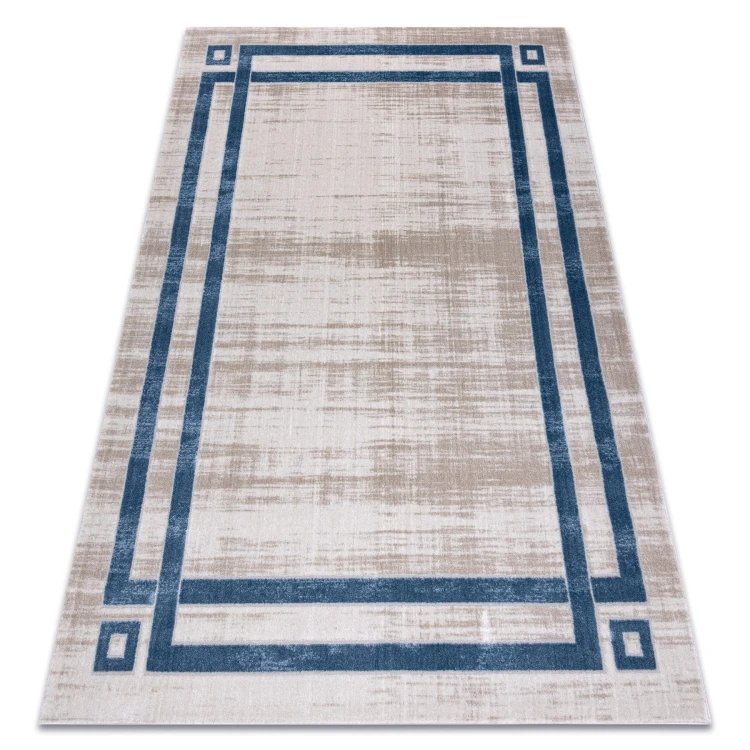 Kremowy dywan z niebieskim wzorem ramki, który doskonale sprawdzi się w salonie, dodając mu klasycznego charakteru.