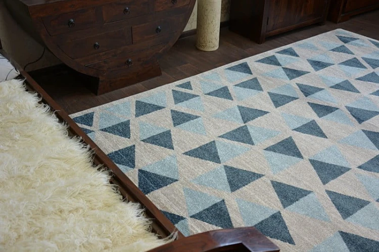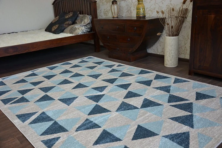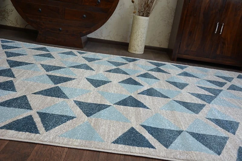 Niebieski dywan z geometrycznym wzorem, który wprowadzi do wnętrza nowoczesny charakter i świeży akcent kolorystyczny.
