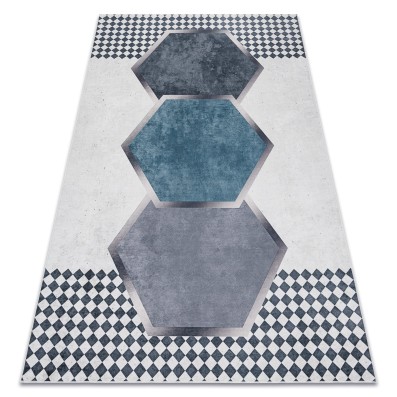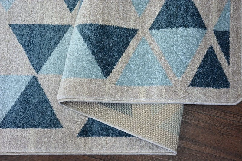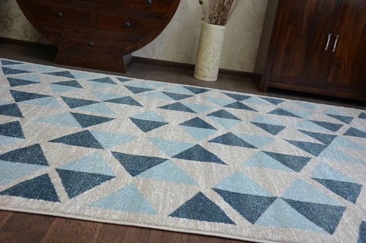 Niebieski dywan z geometrycznym wzorem, który doda korytarzowi nowoczesny charakter i wprowadzi spokojną atmosferę.