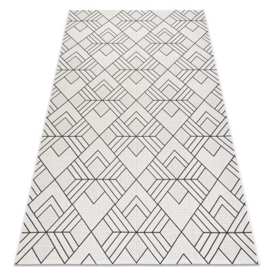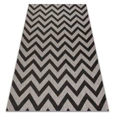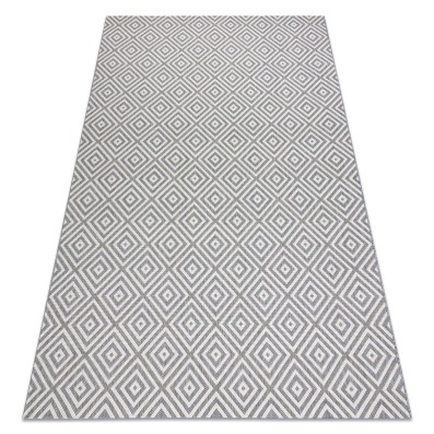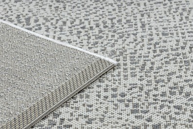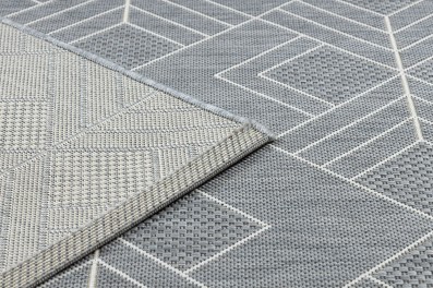 Szary dywan z geometrycznym wzorem, który doskonale sprawdzi się w salonie lub pokoju, nadając wnętrzu nowoczesny charakter.