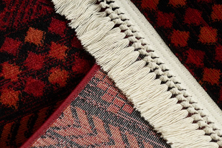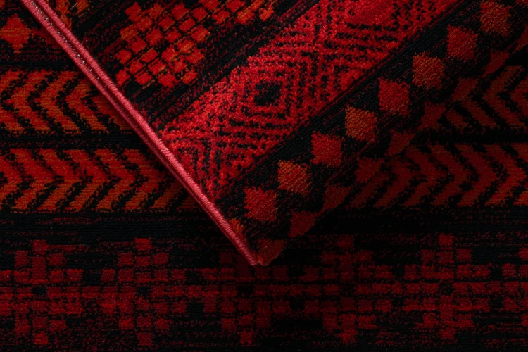 Bordowo-czarny dywan z abstrakcyjnym wzorem, który doda salonowi elegancki charakter i wprowadzi ciepłą, nasycona kolorystyką atmosferę.