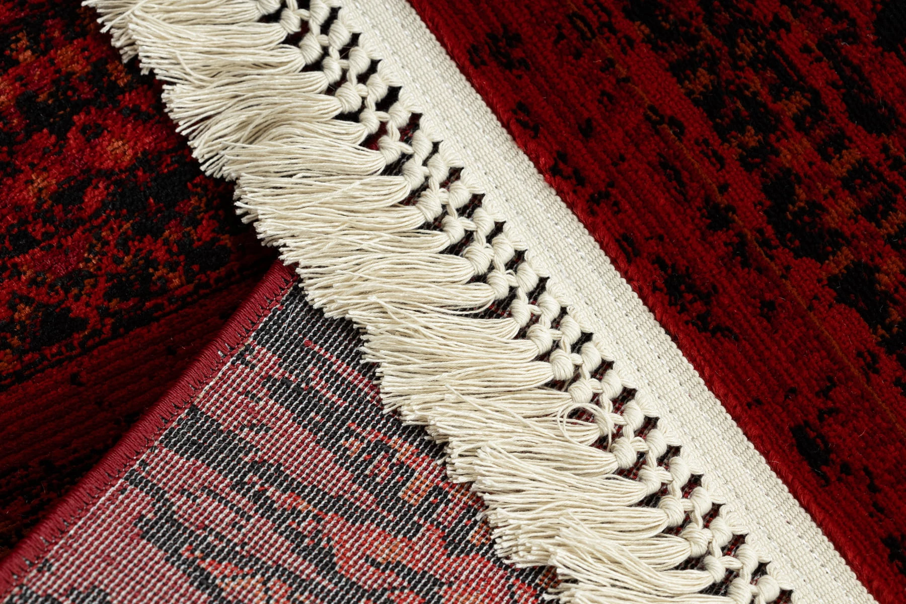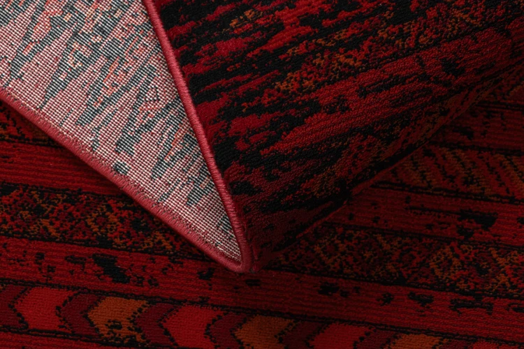 Bordowo-czarny dywan z abstrakcyjnym wzorem, który nada salonowi charakteru i elegancji.