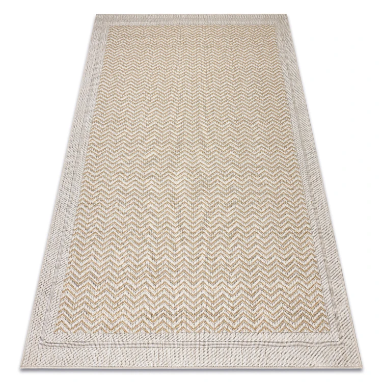 Beżowy dywan sznurkowy z delikatną ramką, który wprowadzi do salonu spokojną, naturalną atmosferę.