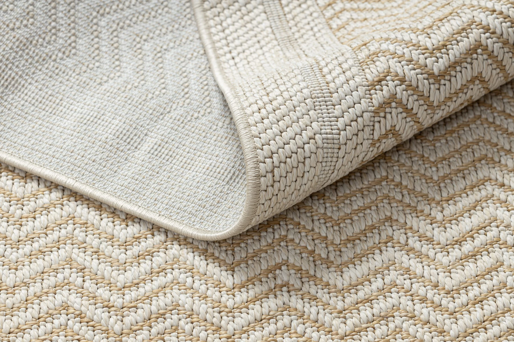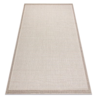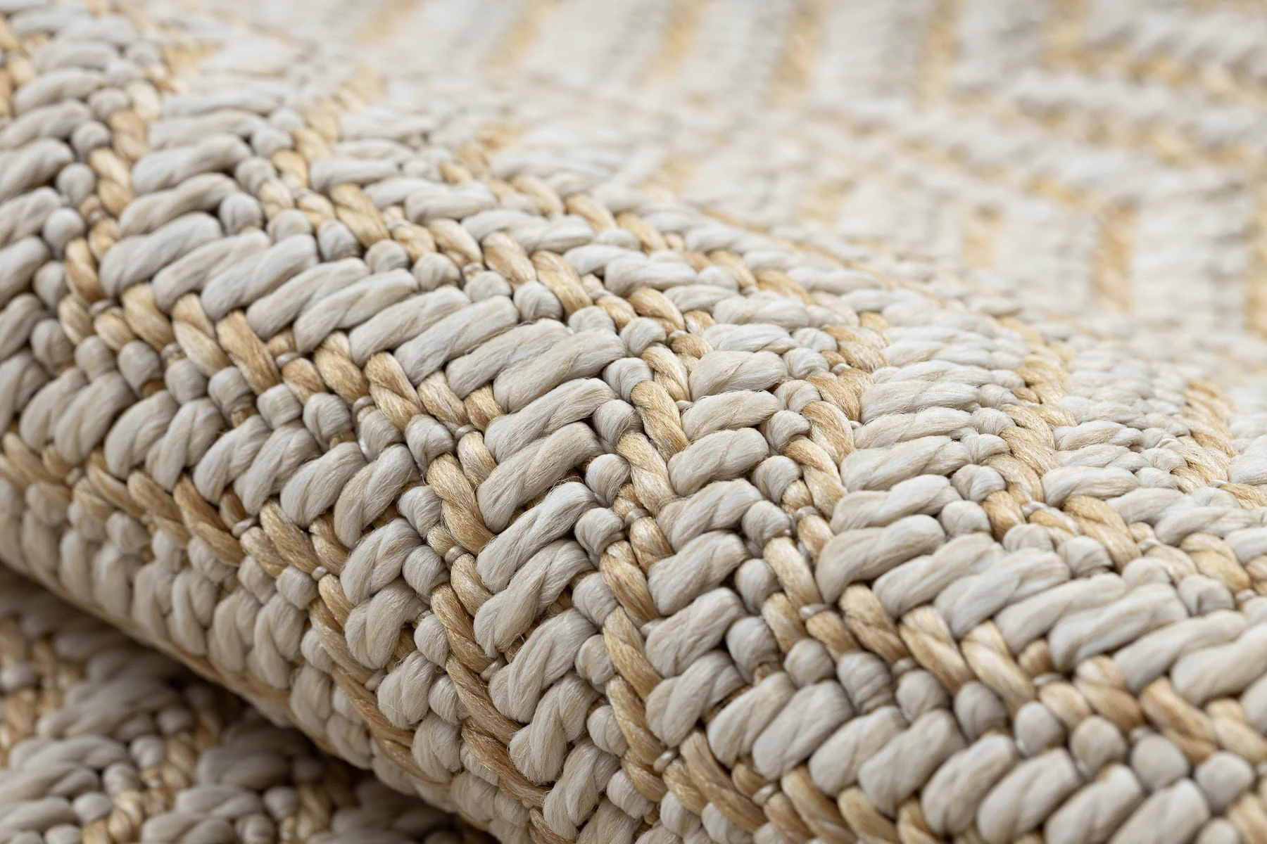 Beżowy dywan sznurkowy z delikatną ramką, który wprowadzi do salonu spokojną, naturalną atmosferę.