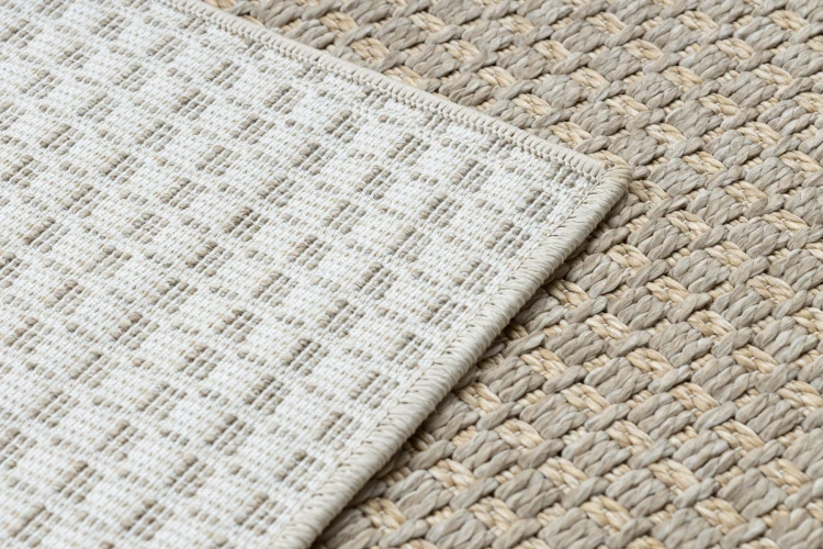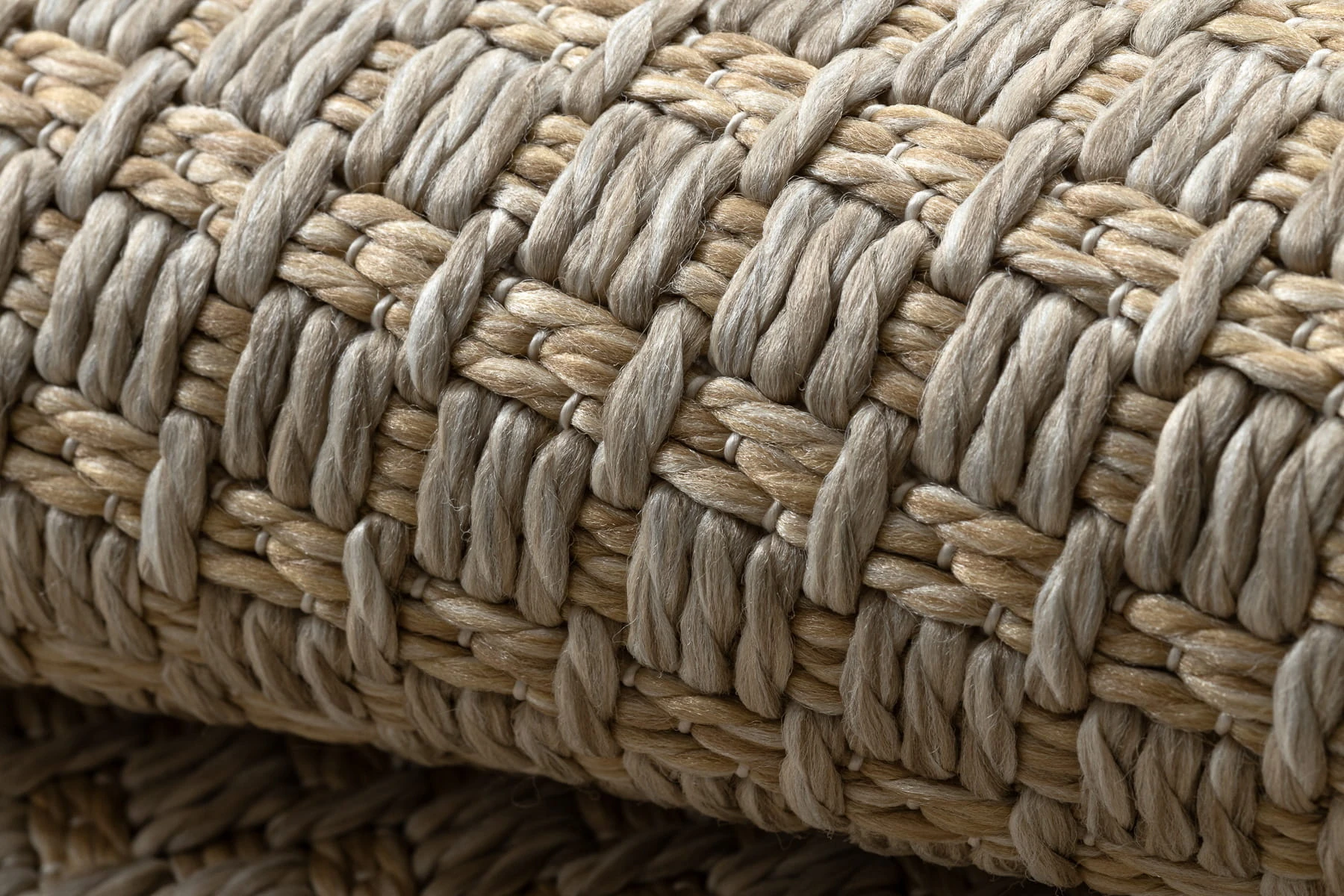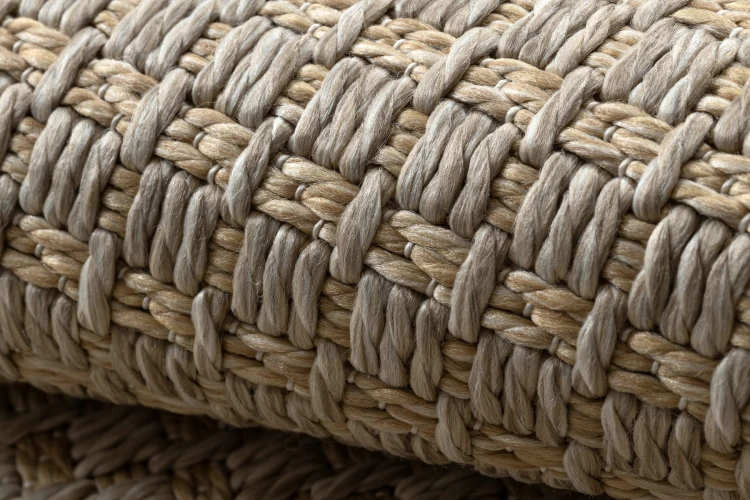 Jednokolorowy beżowy dywan ze sznurkową fakturą, który wprowadzi do salonu naturalną harmonię i ciepły klimat.