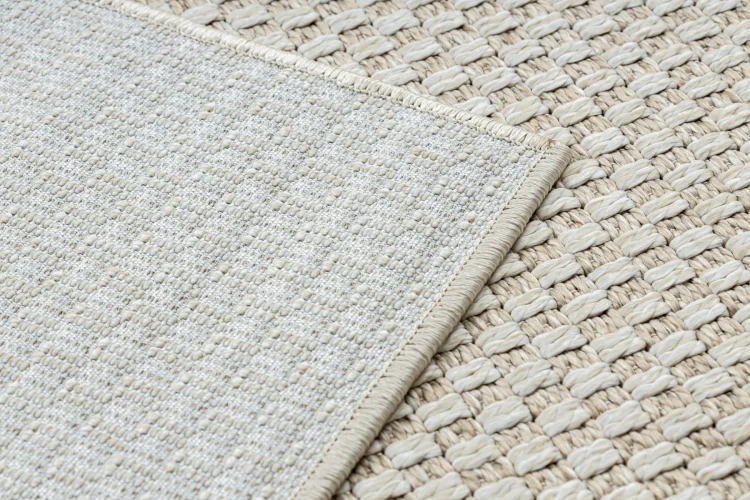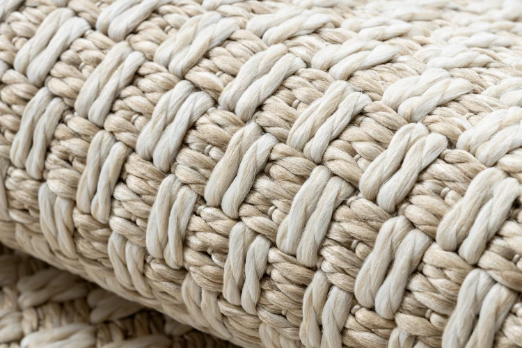 Kremowy dywan jednokolorowy z charakterystyczną sznurkową fakturą, który doda wnętrzu przytulności i naturalnego ciepła.