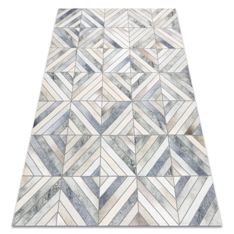 Beżowo-szary dywan z geometrycznym wzorem patchwork, który doskonale sprawdzi się w salonie lub pokoju, nadając wnętrzu nowoczesny charakter.