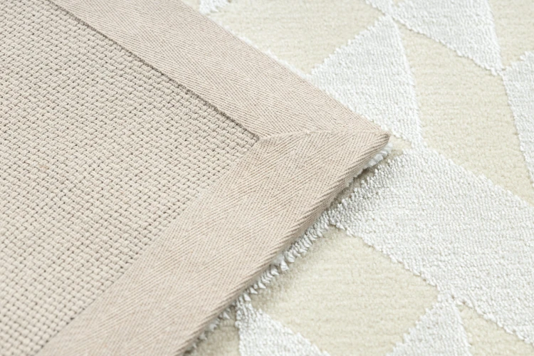 Kremowy dywan z geometrycznym wzorem, który doskonale wpisze się w nowoczesny salon lub pokój, nadając mu elegancki charakter.