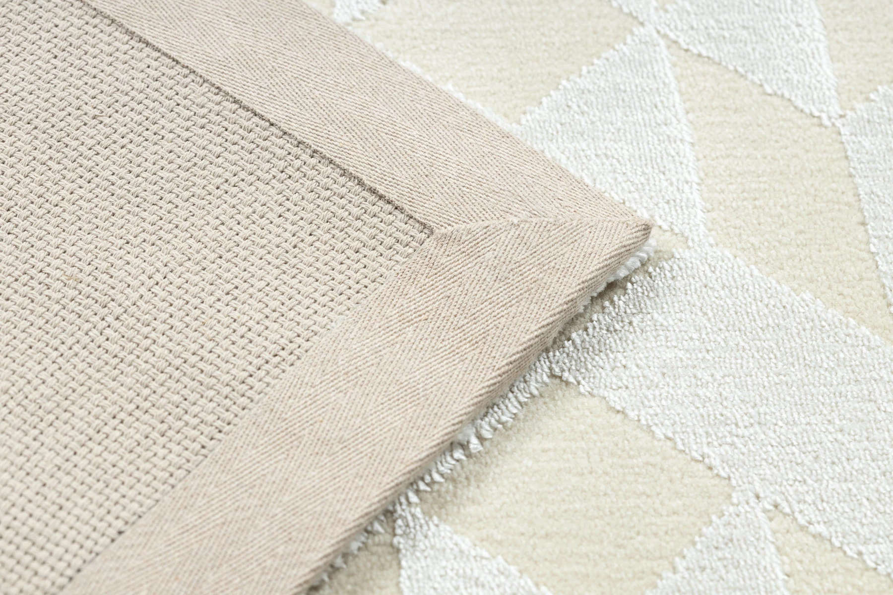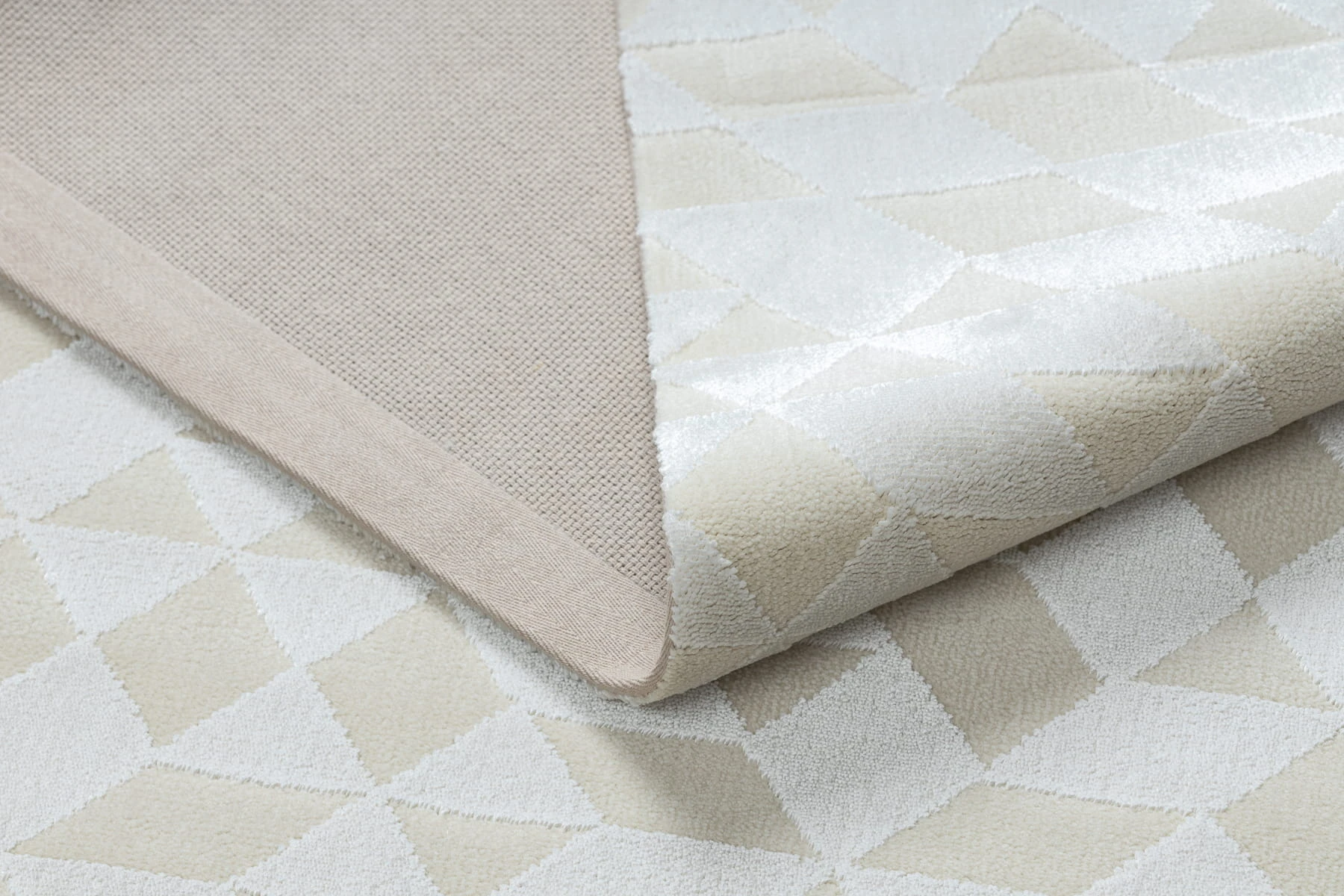 Kremowy dywan z geometrycznym wzorem, który doskonale wpisze się w nowoczesny salon lub pokój, nadając mu elegancki charakter.