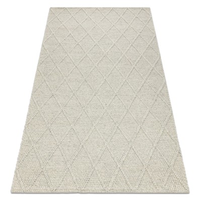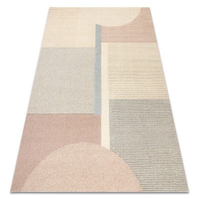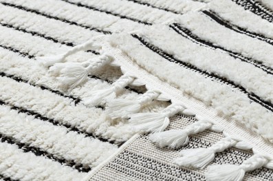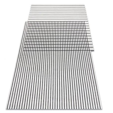 Kremowo-czarny dywan z geometrycznym wzorem, który doskonale wpisze się w nowoczesny salon lub pokój.