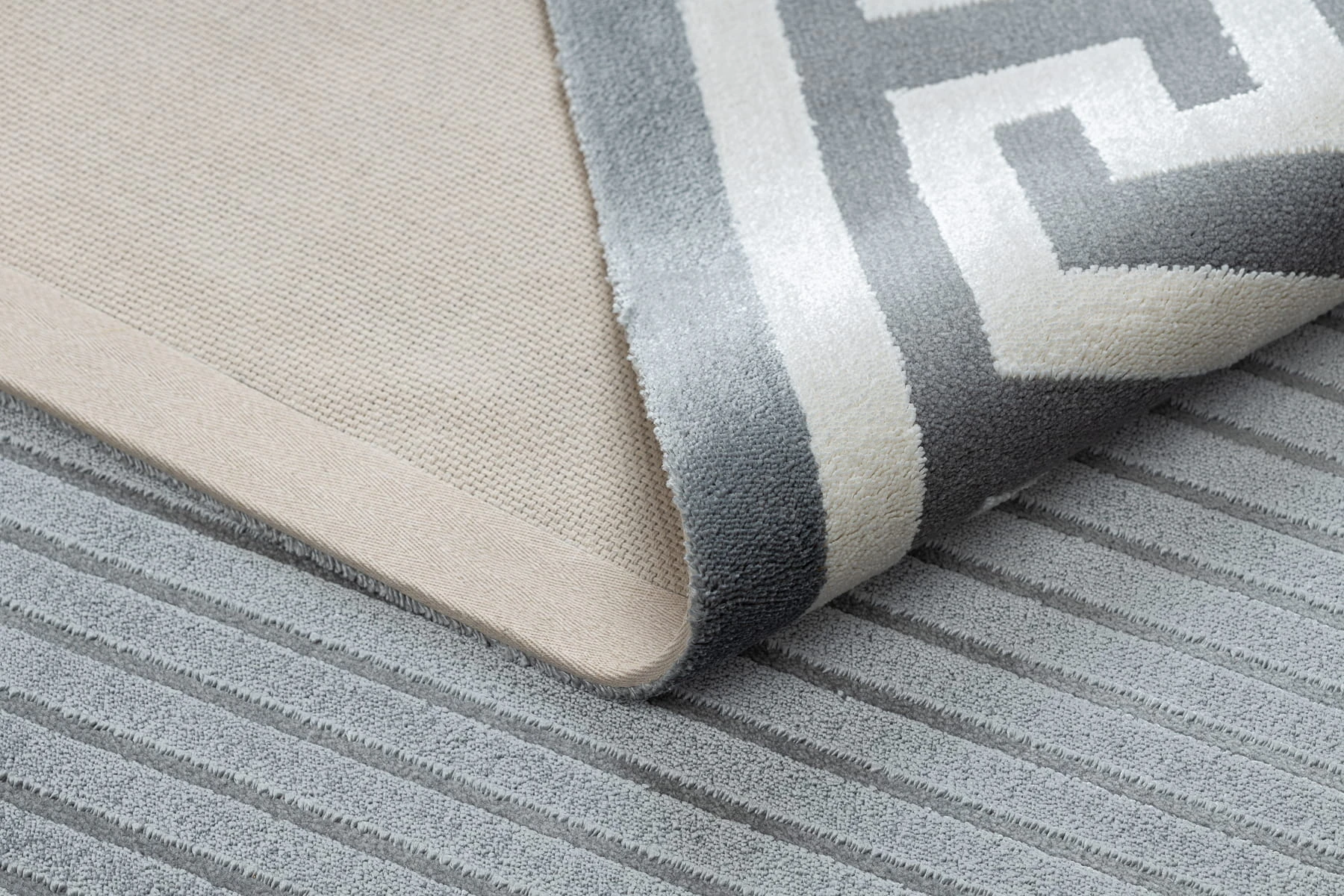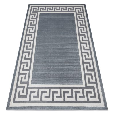 Szary dywan z elegancką ramką, który doskonale sprawdzi się w salonie lub pokoju, dodając wnętrzu stonowany charakter.