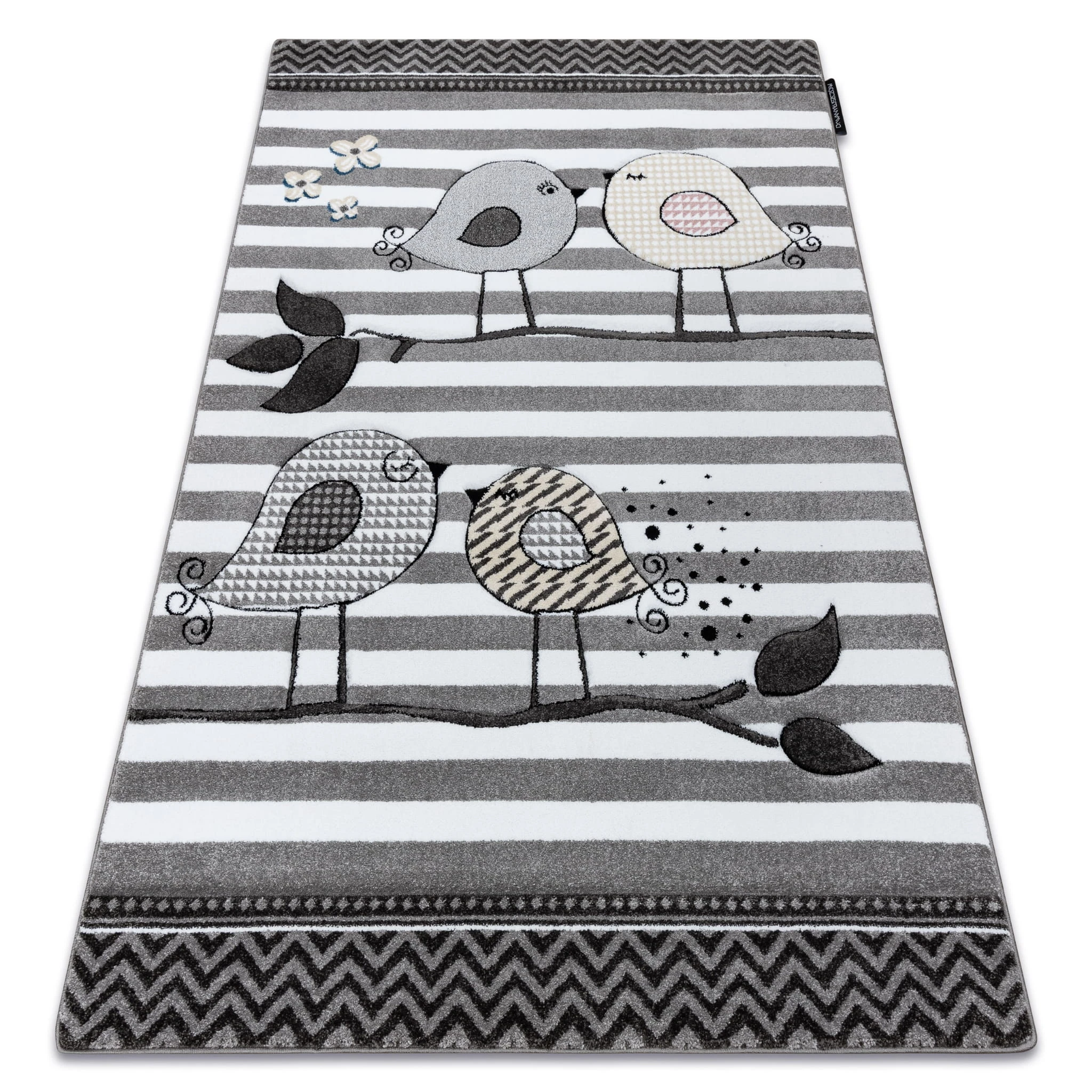 Szary dywan z motywem ptaszków, który subtelnie ożywi pokój dziecka i stworzy przytulną przestrzeń do zabawy.