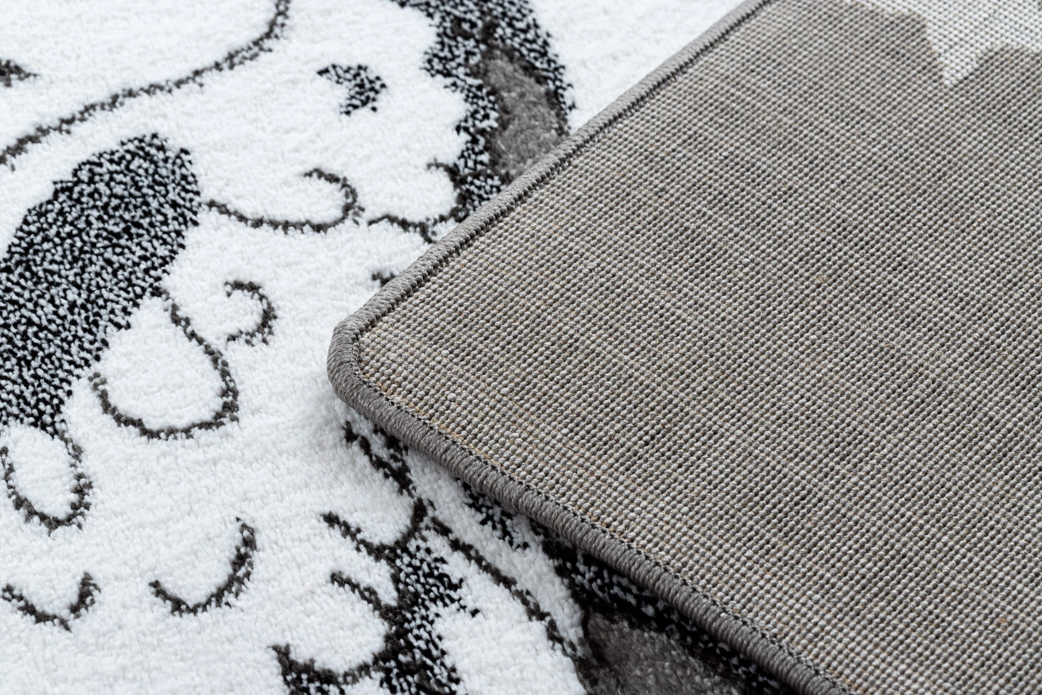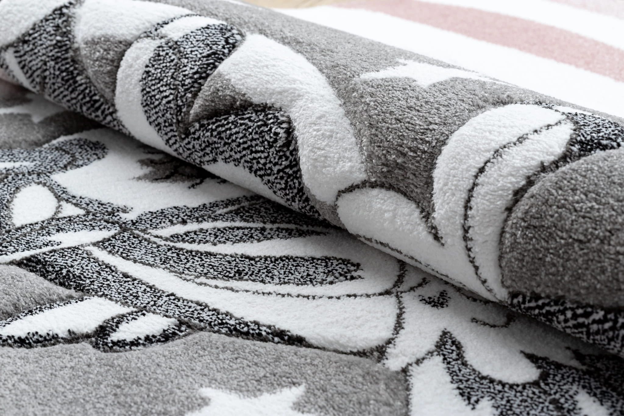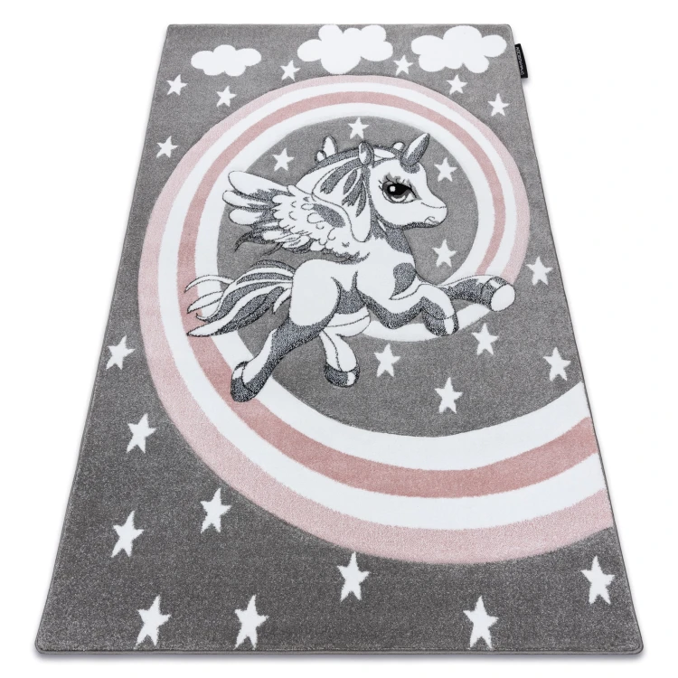 Szary dywan z motywem konika, który subtelnie ożywi pokój dziecka i stworzy przestrzeń do zabawy.