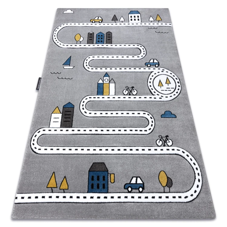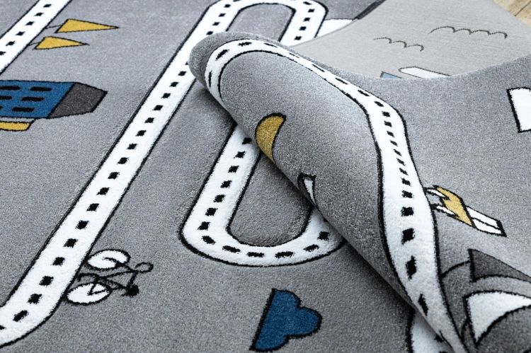 Szary dywan z motywem ulic, który stworzy przestrzeń do zabawy i zachęci do kreatywnych przygód w pokoju dziecka.