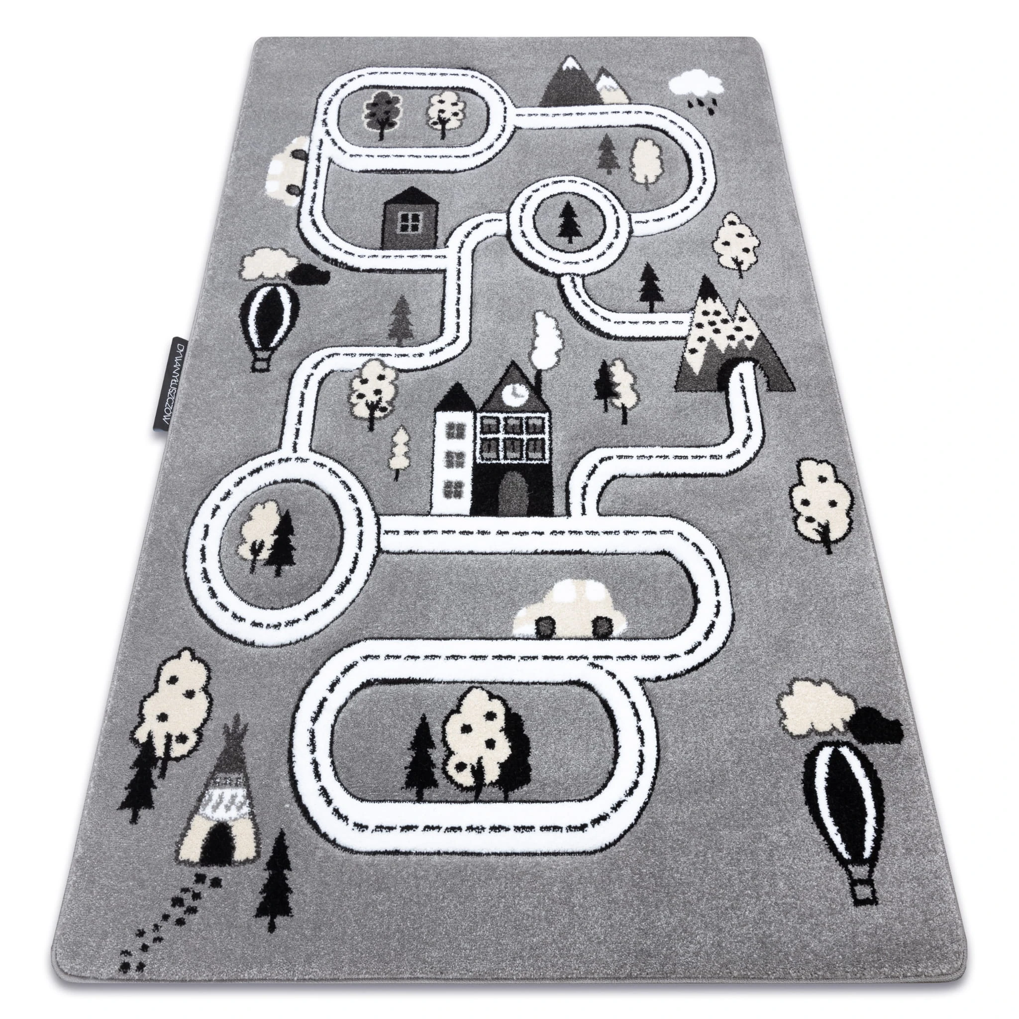 Szary dywan z motywem miasta, który stworzy przestrzeń do zabawy i zachęci do budowania własnych historii.