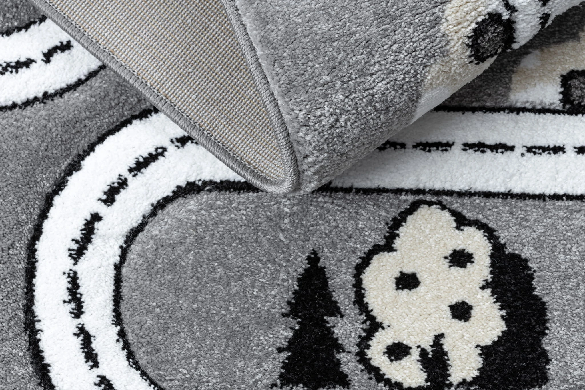Szary dywan z motywem miasta, który zamieni pokój dziecka w miejską przygodę pełną zabawy i wyobraźni.